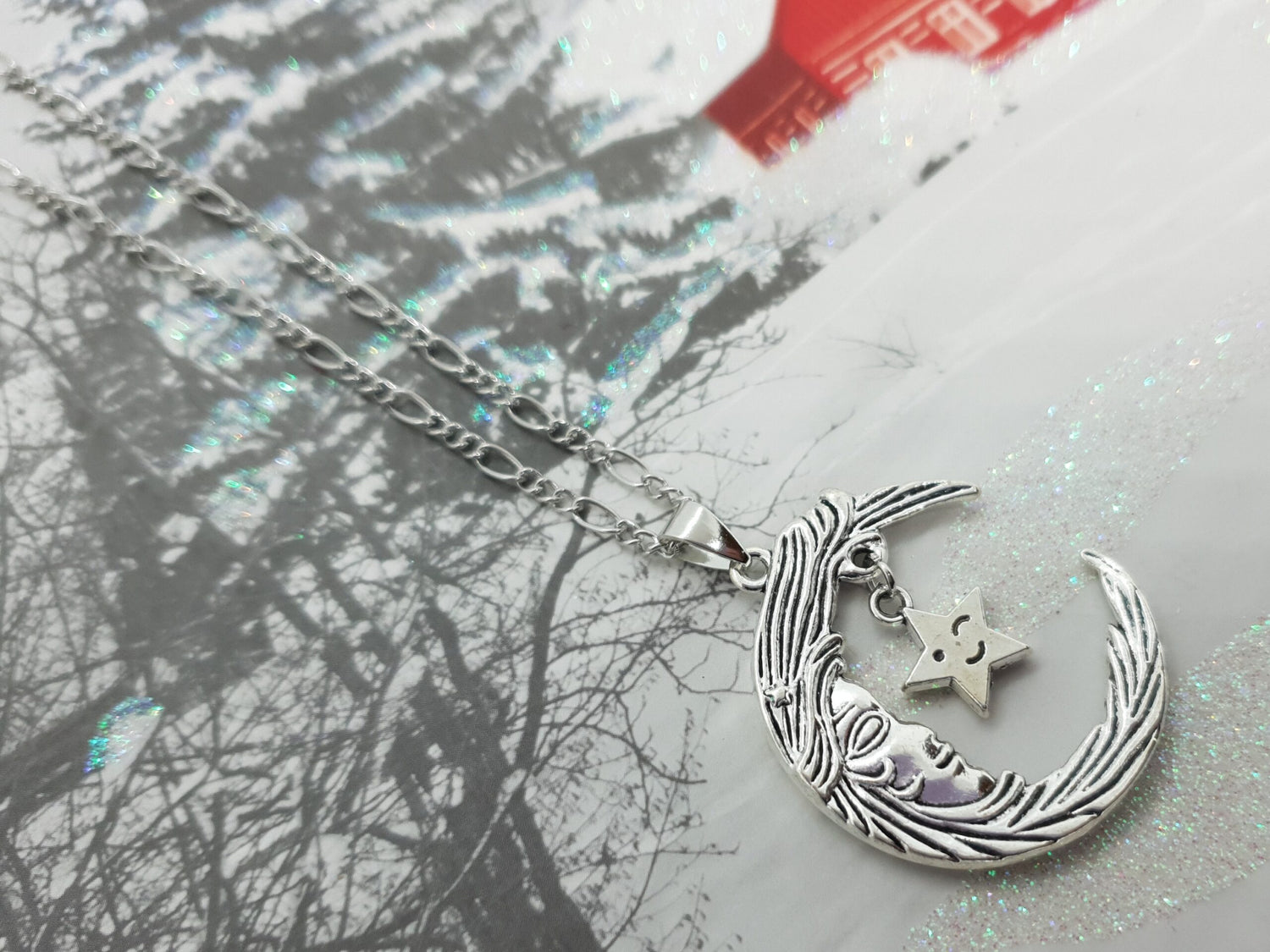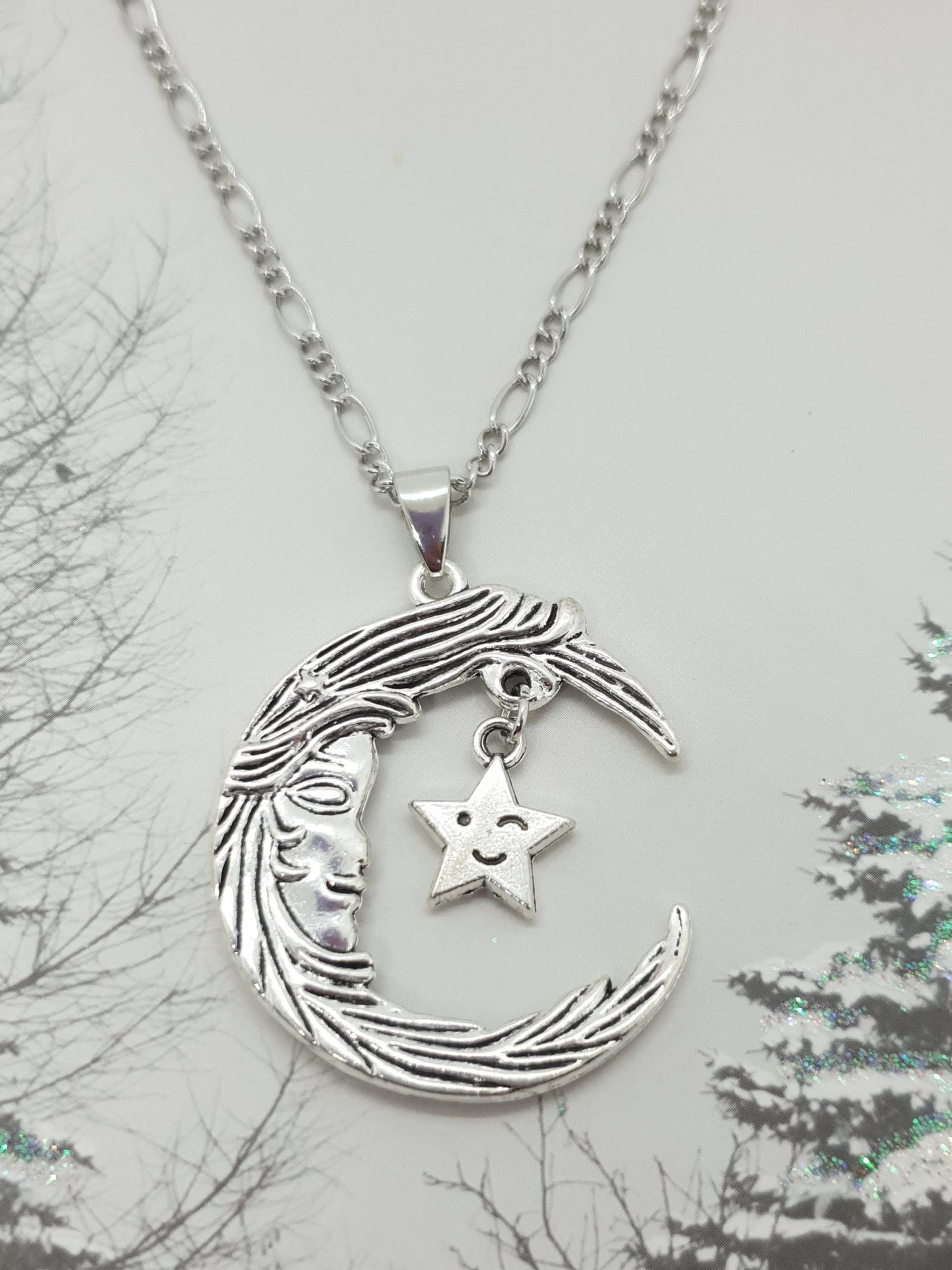 Crescent Moon Face Star Necklace